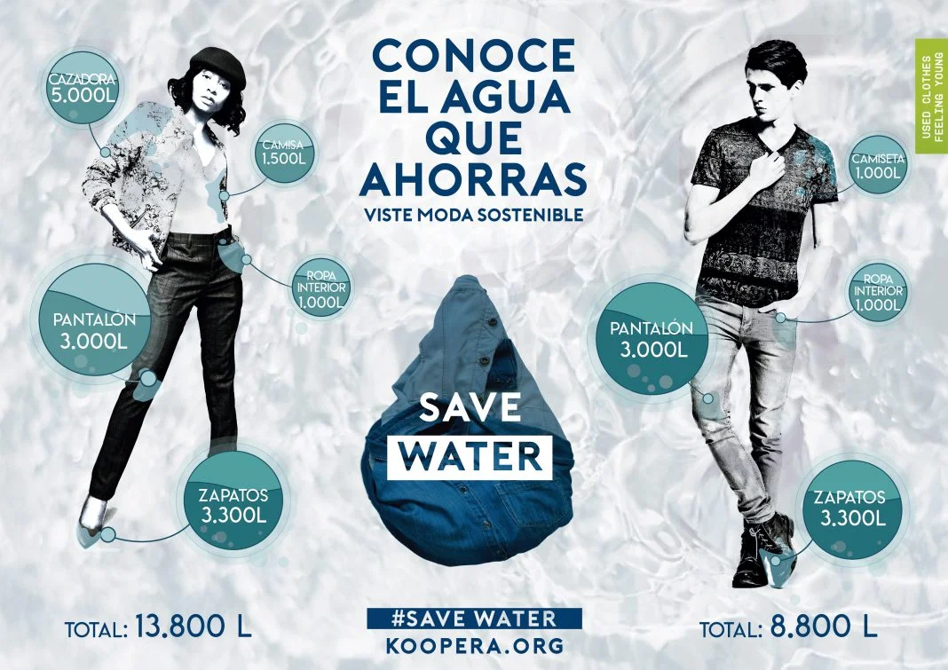 Por estos motivos, desde Koopera Cáritas, no podíamos dejar pasar esta fecha, para hacer un llamamiento al ahorro del agua y al consumo  sostenible en la moda bajo el lema #SaveWater.