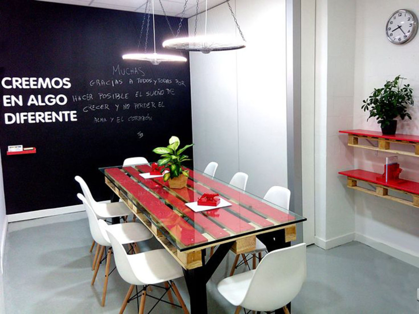 El Upcycling es reutilizar todo aquello que ya no tiene ningún uso y convertirlo en algo nuevo; esto mismo es lo que hemos hecho en las nuevas instalaciones de Koopera Social Training en Deusto (Bilbao). Como podemos ver se han utilizado palets para convertirlos en baldas y  mesas, que pintados en rojo y con un cristal encima dan un toque moderno a las instalaciones. Al mismo tiempo unas viejas ruedas de bicicleta iluminan la sala colgadas del techo dando un aire industrial. Sobre la mesa y las baldas también se pueden apreciar los sujetalibros y pisapapeles, también productos Koopera Upcycling. Muestra que os ofrecemos de que a través del Upcycling se pueden conseguir elementos decorativos muy originales.